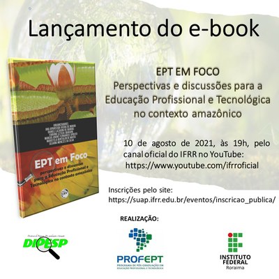E-book – No próximo dia 10 de agosto, às 19 horas, pelo canal oficial do IFRR no Youtube, no endereço www.youtube.com/ifrroficial, ocorrerá o lançamento do e-book “EPT em foco: perspectivas e discussões para a Educação Profissional e Tecnológica no contexto amazônico”, composto por 11 artigos de mestrandos da primeira turma.